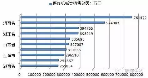 2015年全国医疗器械类销售额排名前10的省区是:广东、河南、北京、浙江、安徽、山东、四川、上海、黑龙江、湖南。排名前10省区销售额占全国销售总额的比例分布为:13.39%、10.10%、6.94%、6.92%、5.90%、5.75%、5.48%、5.21%、4.53%、4.50%。