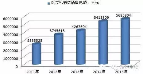 2015年全国医疗器械类销售总额为568.58亿元,较去年增加4.93%。2011-2015年全国医疗器械销售总额复合增长率(CAGR)为17.53%。