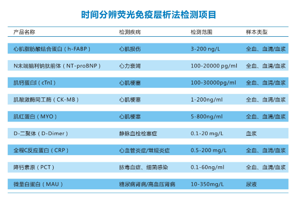 炎症系列 降钙素原(PCT)测定试剂盒 全量程C反应蛋白(CRP)测定试剂盒 心脑血管系列 肌酸激酶同工酶(CK-MB)测定试剂盒 肌钙蛋白I(cTnI)测定试剂盒 肌红蛋白(MYO)测定试剂盒 D-二聚体(D-Dimer)测定试剂盒 心肌脂肪酸结合蛋白(h-FABP)测定试剂盒 N末端脑利钠肽前体(NT-proBNP)测定试剂盒 肾病系列 尿微量白蛋白(MAU)测定试剂盒 适用科室:应用于各类医院的心内科、手术室、急诊科、ICU、检验科、肿瘤科、骨科、肾内科、儿科、内分泌科、妇科、老年科、呼吸科、外科、消化科、泌尿科等科室。